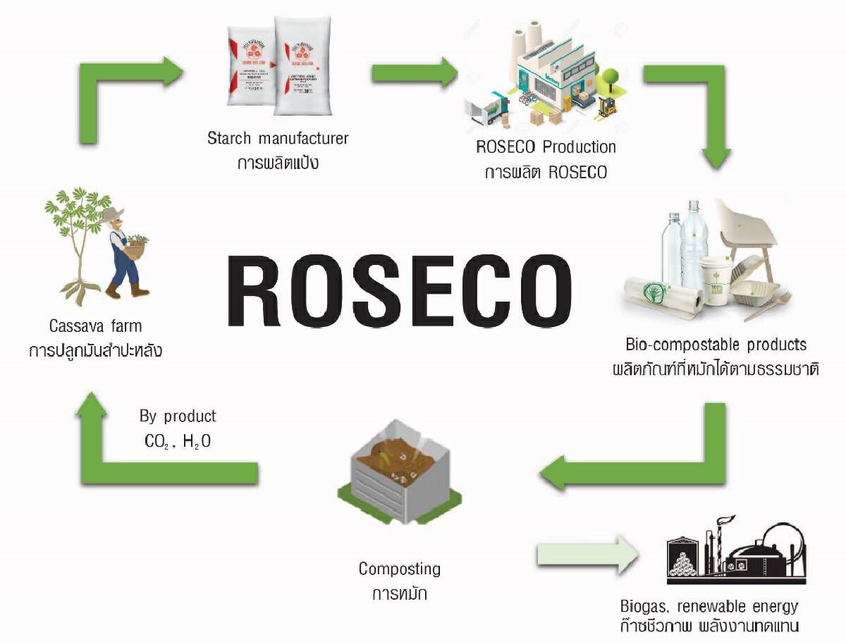 A: Recently, THAI WAH has innovated “ROSECO”, which is a unique type of thermoplastic starch resin derived from Tapioca starch and 100% disposable. It can be used in various applications such as shopping bags, plastic packaging, or plastic bottles and utensils. It can helps increase the sustainability of plastic products with our ROSECO functional thermoplastic biopolymers made from tapioca based, which can replace 30-50% of petroleum-based or compostable polymer resins without reducing the strength of the products or adding manufacturing steps. Reduce costs, improve quality, and reduce the carbon footprint. It can be used in various applications such as shopping bags, plastic packaging, or plastic bottles and utensils.