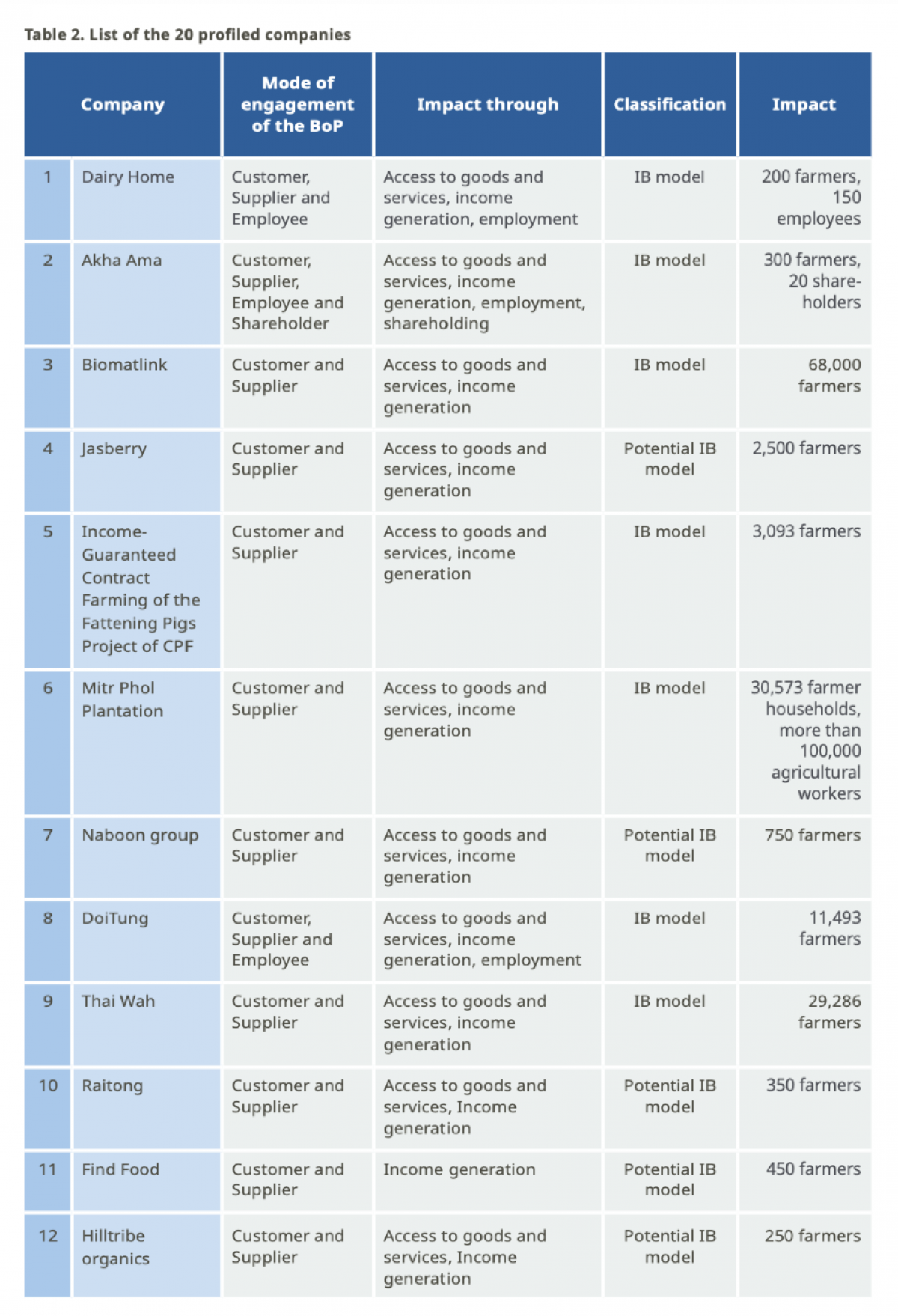 อย่างที่กล่าวไปข้างต้น รายงาน ‘Landscape Study of Inclusive Business in Agrifood Systems in THAILAND’ นำเสนอบริษัทการเกษตรที่ใช้โมเดล IB และมีศักยภาพจะปรับโมเดลธุรกิจเป็นแบบ IB จำนวน 20 แห่งในประเทศไทย โดยประกอบไปด้วย