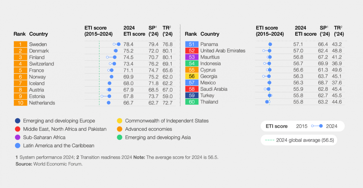 รายงาน Fostering Effective Energy Transition 2024 โดย World Economic Forum ได้จัดทำดัชนีการเปลี่ยนผ่านพลังงาน (Energy Transition Index: ETI) มากว่า 14 ปี ซึ่งเป็นดัชนีวัดประสิทธิภาพของระบบพลังงานใน 120 ประเทศ พิจารณาจาก