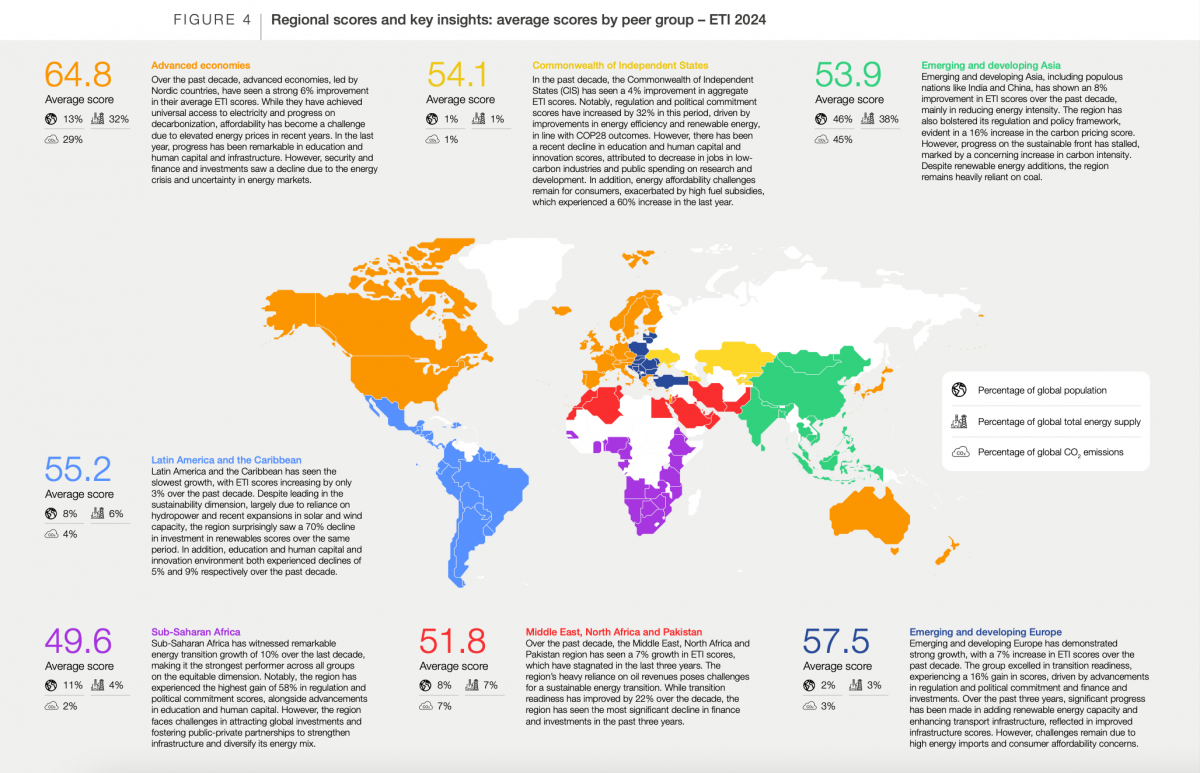 จากปี 2015 ถึง 2024 คะแนนเฉลี่ยทั่วโลกสำหรับ ETI เพิ่มขึ้นอย่างต่อเนื่อง จนกระทั่งปี 2024 ดัชนีการเปลี่ยนผ่านพลังงาน (ETI) มีคะแนนเฉลี่ยทั่วโลกสูงสุดเป็นประวัติการณ์ ประเทศที่ติด 10 อันดับสูงสุดส่วนใหญ่เป็นประเทศเศรษฐกิจก้าวหน้าจากทวีปยุโรปเหนือ โดยมีการปล่อยก๊าซเรือนกระจกรวมกันเพียง 1% ของทั้งโลก เป็นผู้จัดหาพลังงานเพียง 3% ของโลก และมีประชากรรวมกันคิดเป็น 2% ของประชากรโลก ประเทศแถบนอร์ดิกครองทั้ง 3 อันดับแรก ได้แก่ สวีเดน เดนมาร์ก และฟินแลนด์ แต่อันดับ ETI ของนอร์เวย์ลดลงเป็นครั้งแรกในรอบหลายปี เนื่องจากค่าไฟฟ้าที่เพิ่มขึ้นและการก่อสร้างพลังงานหมุนเวียนลดลง