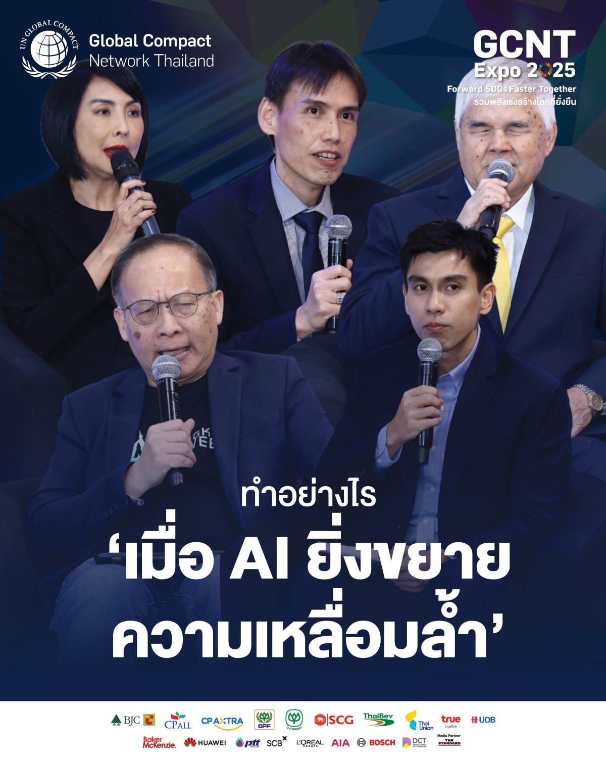 เวทีเสวนา ‘AI for All: Ensuring No One Is Left Behind in the Age of AI’ ซึ่งจัดขึ้นภายใต้ GCNT EXPO 2025: Forward SDGs Faster Together จึงเกิดขึ้นด้วยเป้าหมายสำคัญคือการตั้งคำถามอย่างตรงไปตรงมาและร่วมกันแสวงหาคำตอบว่า ‘เราจะออกแบบการพัฒนา AI อย่างไรให้เป็นของทุกคน ไม่ใช่เพียงของคนบางกลุ่ม’