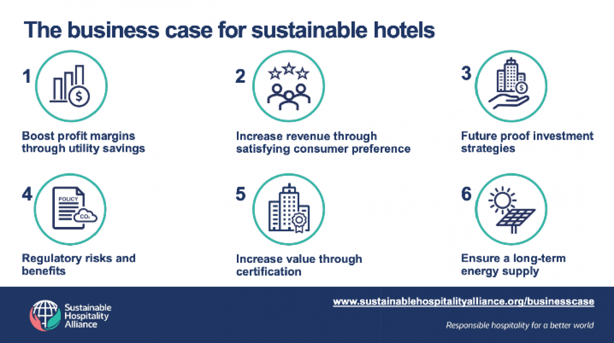 ในปี 2020 Sustainable Hospitality Alliance เครือข่ายพันธมิตรโรงแรมกว่า 50,000 แห่งทั่วโลก ได้ร่วมมือกับ International Finance Corporation (IFC) สถาบันการเงินในเครือของธนาคารโลก จัดทำ Business Case for Sustainable Hotels รวบรวมกรณีศึกษาโรงแรมที่ดำเนินการอย่างยั่งยืนซึ่งแสดงให้เห็นการลดใช้ทรัพยากร การประหยัดสาธารณูปโภค และผลตอบแทนจากการลงทุนที่จับต้องได้จริง และนี่คือตัวอย่างบางส่วน