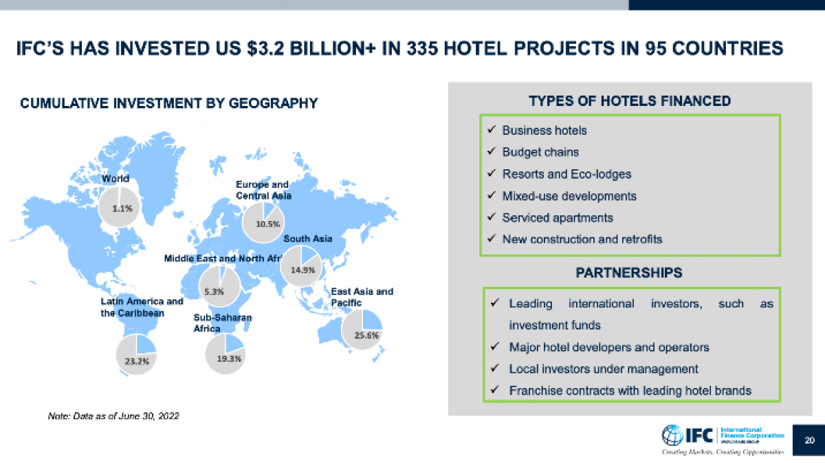 IFC ได้ลงทุนในโครงการด้านโรงแรมในตลาดเกิดใหม่ของประเทศที่กำลังพัฒนา 95 ประเทศ มาตั้งแต่ปี 1967 โดยปัจจุบัน IFC กำลังขับเคลื่อนพาร์ทเนอร์การลงทุนให้สนับสนุนการสร้างอาคารหรืออสังหาริมทรัพย์ที่เป็นมิตรต่อสิ่งแวดล้อม (green building)