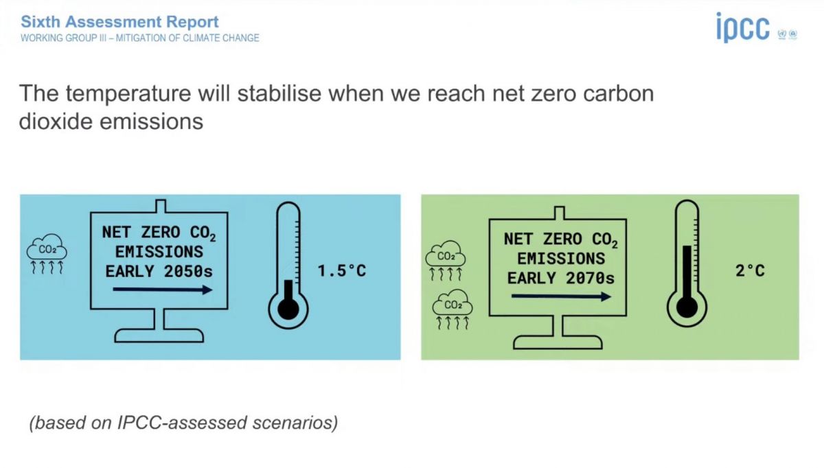 Limiting warming to around 2 degrees still requires global emissions to peak before 2025 at the latest, to be reduced by about a quarter by 2030. The temperature will stabilize when we reach net zero carbon dioxide emissions. So to limit warming to around 1.5 degrees requires reaching net zero carbon dioxide emissions in the early 2050.