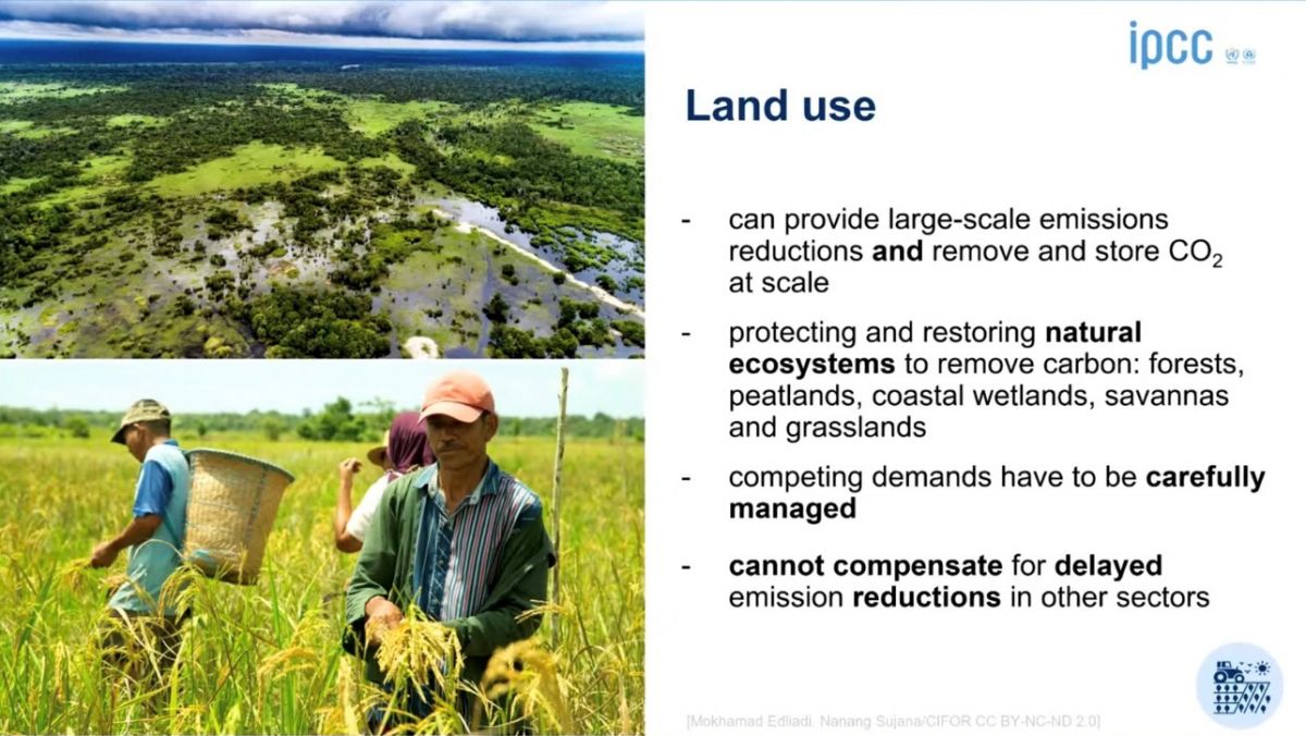 These competing demands have to be carefully managed. But land can only do so much in terms of removing and storing carbon, and cannot compensate for delayed emission reductions in other sectors.