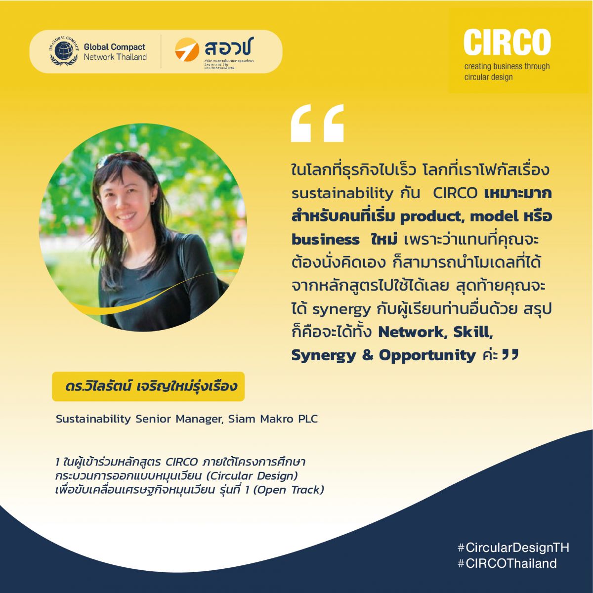 Supply Chain Synergy ชวนสนทนากับ ดร.วิไลรัตน์ เจริญใหม่รุ่งเรือง Sustainability Senior Manager บริษัท สยามแม็คโคร ถึงแนวทางการนำองค์ความรู้ ความร่วมมือและโอกาสที่ได้จากหลักสูตร Circo Circular Design รุ่นที่ 1 ไปประสานศักยภาพของห่วงโซ่อุปทานของสยามแม็คโคร เพื่อไปถึงเป้าหมายเศรษฐกิจหมุนเวียน