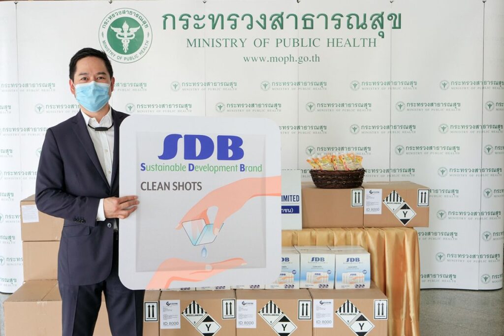 นายแดน ปฐมวาณิชย์ (ที่ 2 จากซ้าย) ประธานเจ้าหน้าที่บริหาร บริษัท เอ็นอาร์ อินสแตนท์โปรดิวซ์ จำกัด (มหาชน) หรือ NRF และนางศุภจี สุธรรมพันธุ์ (ที่ 1 จากซ้าย) ประธานเจ้าหน้าที่บริหารกลุ่ม บริษัท ดุสิตธานี จำกัด (มหาชน) และกรรมการบริษัทของ NRF ขอร่วมเป็นส่วนหนึ่งในการสนับสนุนและส่งกำลังใจให้แก่บุคลากรทางการแพทย์ ด้วยการมอบเจลแอลกอฮอล์ Hand sanitizers แบรนด์ SDB (Sustainable Development Brand) จำนวน 50,000 ชิ้น มูลค่า 250,000 บาท และน้ำเต้าหู้พาสเจอไรส์ รสคอลลาเจน แบรนด์ชินโป (Shinpo) จำนวน 1,000 แพค มูลค่า 13,000 บาท ซึ่งเป็นผลิตภัณฑ์ภายใต้แบรนด์ของกลุ่มบริษัท NRF รวมมูลค่ากว่า 263,000 บาท โดยมี นายอนุทิน ชาญวีรกุล (กลาง) รัฐมนตรีว่าการกระทรวงสาธารณสุข เป็นผู้รับมอบ ณ กระทรวงสาธารณสุข เพื่อร่วมขอบคุณและขอชื่นชมบุคลากรทางการแพทย์ พยาบาล เจ้าหน้าที่ทุกท่านที่ปฎิบัติงานอย่างทุ่มเทในการควบคุมและป้องกันการแพร่ระบาดของเชื้อไวรัสโคโรนา (COVID-19) จนสามารถคุมสถานการณ์ในระยะเวลาอันสั้น