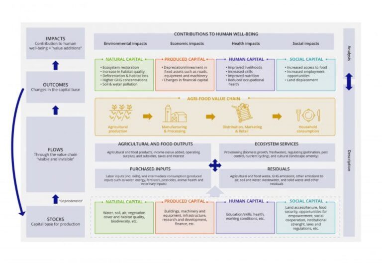 กรอบการประเมินทั้ง 4 ทุนจากกระบวนการผลิต (การปลูกและการเก็บสต็อก) กระบวนการไหลของวัตถุดิบในห่วงโซ่คุณค่าของสายการผลิตทั้งที่เห็นด้วยตา และที่มองไม่เห็น ผลลัพธ์จากการเปลี่ยนคุณค่าและมูลค่าในห่วงโซ่คุณค่า และท้ายสุดคือการประเมินผลกระทบต่างๆ ที่เกิดขึ้นตลอดเส้นทางของระบบอาหาร ที่ส่งผลต่อความเป็นอยู่ของมนุษย์ไปยังการอาศัยอยู่ของมนุษย์