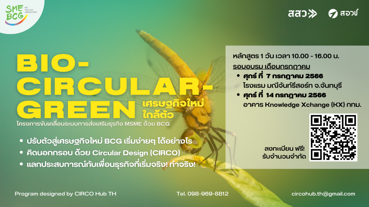 ทั้งนี้ โครงการขับเคลื่อนระบบการส่งเสริมธุรกิจ MSME ด้วย BCG (BIO-CIRCULAR-GREEN ECONOMY ภายใต้การสนับสนุนจาก สำนักงานส่งเสริมวิสาหกิจขนาดกลางและขนาดย่อม (สสว.) โดยความร่วมกับมือ สำนักงานสภานโยบายการอุดมศึกษา วิทยาศาสตร์ วิจัยและนวัตกรรมแห่งชาติ (สอวช.) และ UN GCNT ตั้งเป้าหมายจัดกิจกรรมสร้างความตระหนักรู้และเข้าใจเรื่อง BCG ให้กับผู้ประกอบการ MSME จำนวน 1,000 ราย ใน 5 ภูมิภาคทั่วประเทศระหว่างเดือนมีนาคม – กรกฎาคม 2566 ผู้สนใจสามารถลงทะเบียนเข้าอบรมฟรี!
