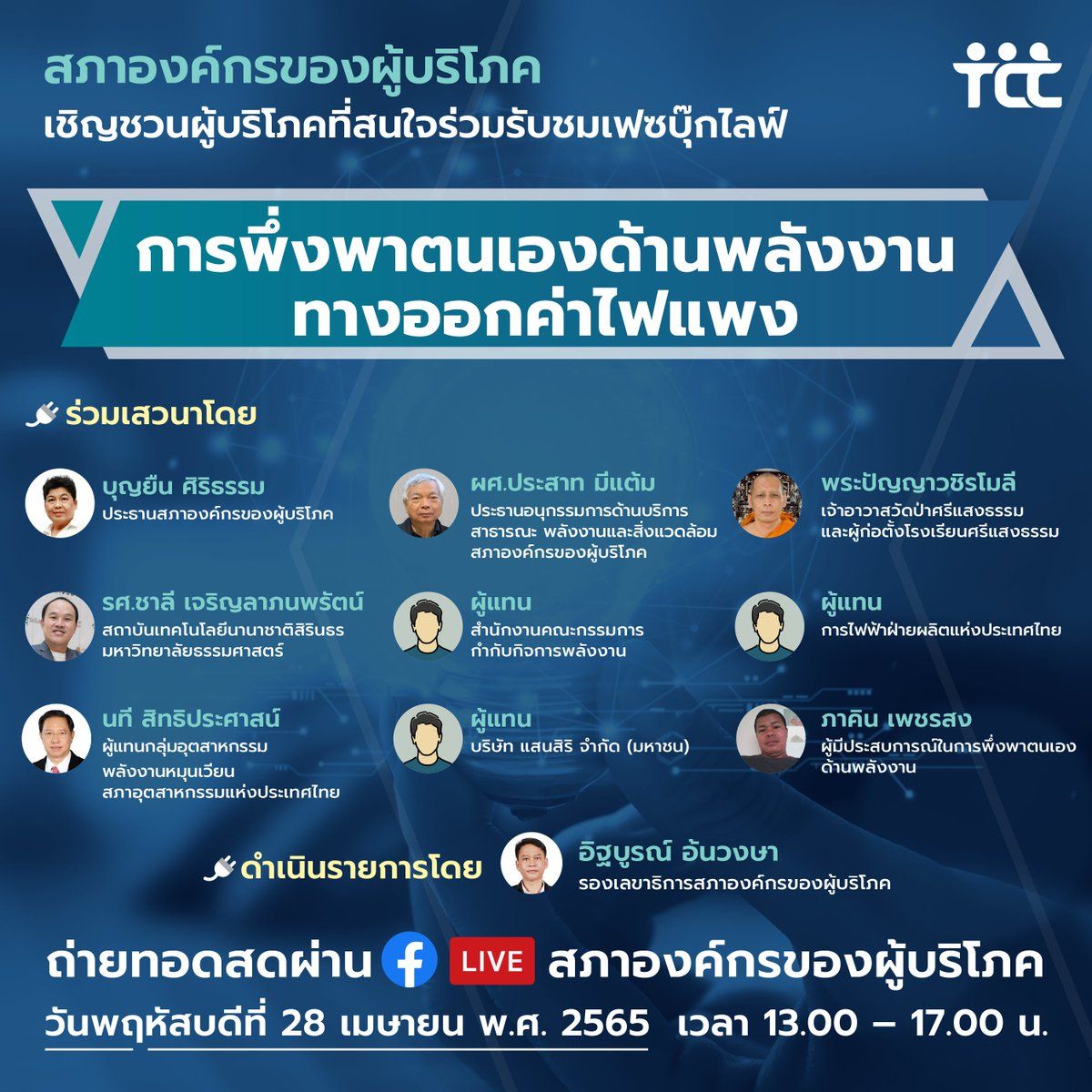 สภาองค์กรของผู้บริโภค เห็นว่าการส่งเสริมให้เกิดการพึ่งพาตนเองด้านพลังงานของผู้ใช้ไฟฟ้า เป็นหนี่งในทางออกที่น่าจะมีประสิทธิภาพ จึงได้เวทีเสวนาแลกเปลี่ยนความคิดเห็น และชวนผู้บริโภคร่วมหาทางออก ในเวที