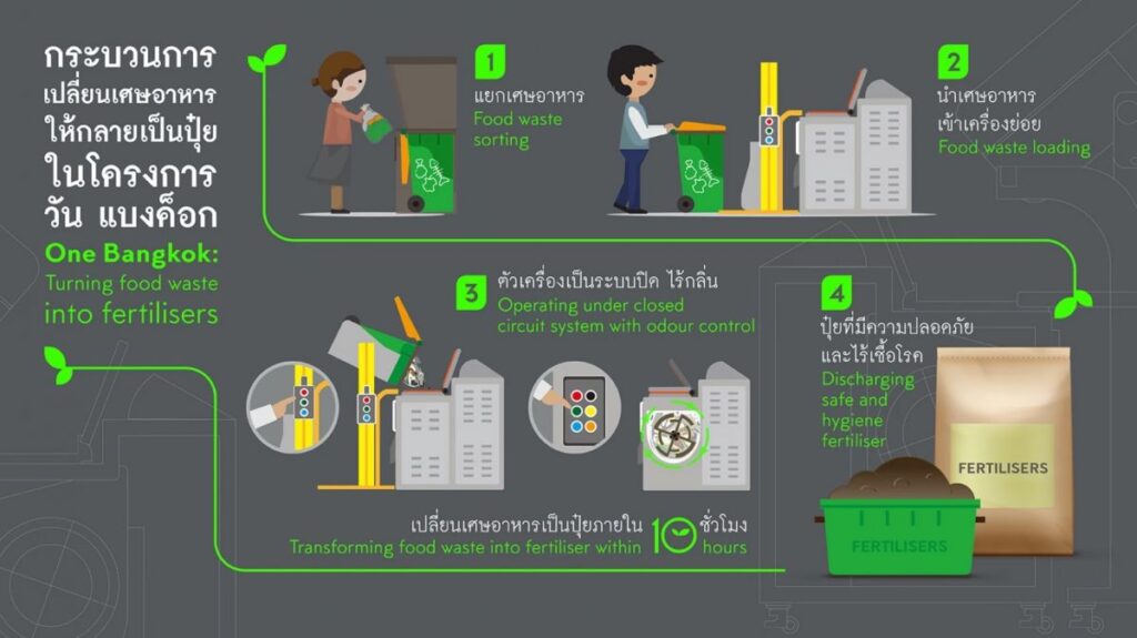 • การจัดการเศษอาหารด้วยเครื่องย่อยเศษอาหารเพื่อเปลี่ยนเศษอาหารให้กลายเป็นปุ๋ย เป็นการนำเทคโนโลยีประสิทธิภาพสูงที่ได้รับการยอมรับและใช้ในสถานที่ชั้นนำทั่วโลก มาแปรรูปเศษอาหาร ขยะอินทรีย์ให้เป็นปุ๋ยและวัสดุปรับปรุงดินและนำมาใช้ปลูกต้นไม้ภายในโครงการและสถานที่อื่นๆ โดยตัวเครื่องสามารถย่อยเศษอาหารเป็นปุ๋ยภายใน 10 ชั่วโมง อีกทั้งยังใช้ระบบปิด (Operated in Closed Circuit System) ที่สามารถป้องกันกลิ่นไม่พึงประสงค์จากขยะเศษอาหารขณะเครื่องทำงาน และได้ปุ๋ยและวัสดุปรับปรุงดินที่มีความปลอดภัย ไร้เชื้อโรคและมีแร่ธาตุตามเกณฑ์ของกรมวิชาการเกษตร เครื่องย่อยเศษอาหารดังกล่าวนี้จะถูกนำมาใช้ตั้งแต่ช่วงการก่อสร้างโครงการฯซึ่งจะมีเศษอาหารจากการบริโภคของคนงานก่อสร้าง ไปจนถึงช่วงเปิดดำเนินการในเฟสแรก ซึ่งจะถูกนำมาใช้กับทุกส่วนของโครงการวัน แบงค็อก