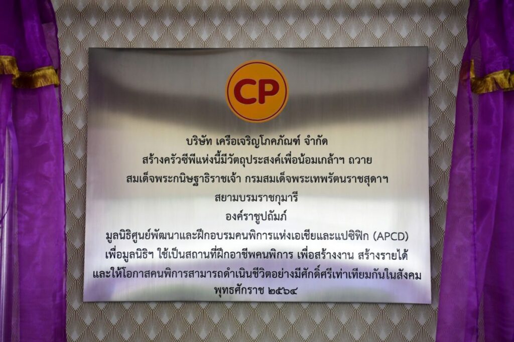 วันที่ 4 เมษายน 2565 – สมเด็จพระกนิษฐาธิราชเจ้า กรมสมเด็จพระเทพรัตนราชสุดาฯ สยามบรมราชกุมารี เสด็จพระราชดำเนินเป็นการส่วนพระองค์ ทรงเปิดโครงการ 60+Plus Kitchen by CP หรือ ครัวซีพีฝึกอาชีพคนพิการ ณ อาคาร APCD Training Center มูลนิธิศูนย์พัฒนาและฝึกอบรมคนพิการแห่งเอเชียและแปซิฟิกในพระราชูปถัมภ์ ในการนี้ได้พระราชทานพระราชวโรกาสให้ คุณสุภกิต เจียรวนนท์ ประธานกรรมการ เครือเจริญโภคภัณฑ์ พร้อมด้วยคณะผู้บริหาร คุณวิบูลย์ คูสกุล ที่ปรึกษาเครือฯ, คุณประสิทธิ์ บุญดวงประเสริฐ ประธานคณะผู้บริหาร บริษัท เจริญโภคภัณฑ์อาหาร จำกัด (มหาชน) และ คุณสุนทร จักษุกรรฐ์ รองกรรมการผู้จัดการอาวุโส ธุรกิจห้าดาวและร้านอาหาร CPF เข้าเฝ้าทูลละอองธุลีพระบาทน้อมเกล้าน้อมกระหม่อมถวายโครงการ 60+ Plus Kitchen by CP เพื่อใช้เป็นสถานที่ฝึกอบรมอาชีพด้านธุรกิจร้านอาหารและบริการให้แก่คนพิการ พร้อมทั้งทูลเกล้าฯ ถวายเงินทุนสนับสนุนการดำเนินงานของมูลนิธิ APCD ด้วย