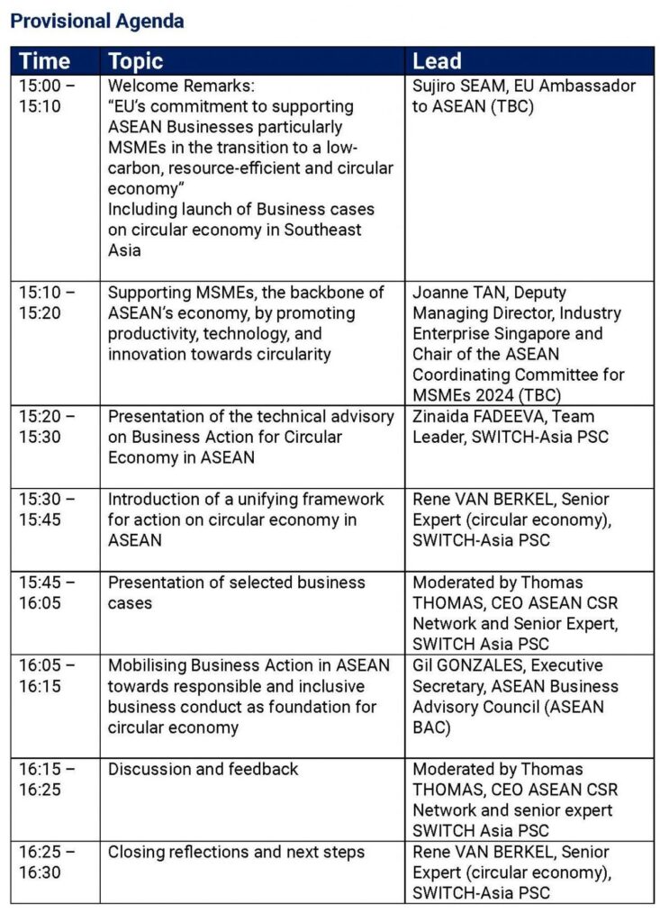 โดยมีวัตถุประสงค์ เพื่อเปิดตัวกรณีศึกษาด้านเศรษฐกิจหมุนเวียนในประเทศกัมพูชา อินโดนีเซีย ฟิลิปปินส์ ไทยและเวียดนาม ซึ่งจะทำให้เกิดการเรียนรู้และแลกเปลี่ยนประสบการณ์ หารือแนวทางการพัฒนาธุรกิจและการดำเนินงานด้านเศรษฐกิจหมุนเวียนในภายหลัง