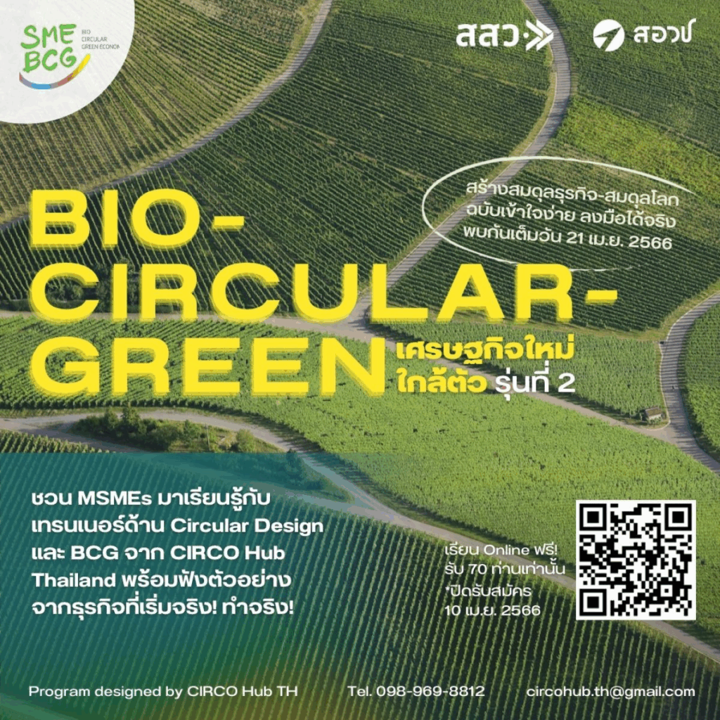 CIRCO Hub ประเทศไทย ภายใต้การสนับสนุนจาก สสว.และ สอวช. แนะนำหลักสูตรกึ่งปฏิบัติการ 1 วันเต็ม สำหรับผู้ประกอบการ นักพัฒนาธุรกิจ นักออกแบบและพัฒนาผลิตภัณฑ์และบริการ และผู้ที่สนใจด้าน BCG ที่ออกแบบมาให้ผู้เรียนเข้าใจได้ง่าย แบบ Back-to-Basic เพื่อให้เริ่มลงมือได้ด้วยตัวเอง