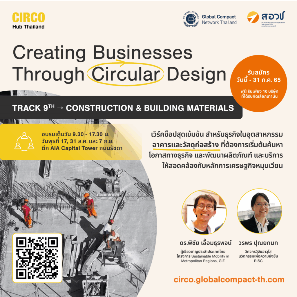 เปิดรับสมัครผู้ประกอบการเข้าร่วมเรียนรู้ในหลักสูตร CIRCO: Creating Business Through Circular Design รุ่นที่ 9 ในเส้นทางธุรกิจ อาคารและวัสดุก่อสร้าง (Construction & Building Materials)