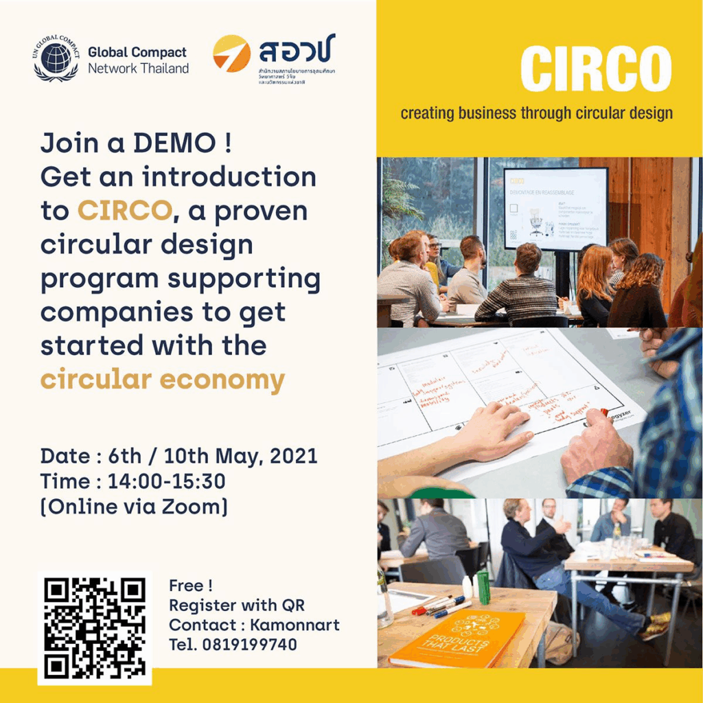 สมาคมเครือข่ายโกลบอลคอมแพ็กแห่งประเทศไทย ขอเชิญนักพัฒนาผลิตภัณฑ์ นักพัฒนาธุรกิจ ทีมกลยุทธ์ธุรกิจ และผู้ที่สนใจเข้าร่วมการสัมมนาเชิงปฏิบัติการ ‘CIRCO DEMO Workshop’ กับวิทยากรจาก CIRCO ประเทศเนเธอร์แลนด์ ที่จะมาแนะนำเครื่องมือการออกแบบหมุนเวียน (Circular Design methodology) ภายใต้แนวคิด “Creating business through circular design” เพื่อการออกแบบผลิตภัณฑ์ บริการ โมเดลธุรกิจและนวัตกรรมในเศรษฐกิจหมุนเวียน