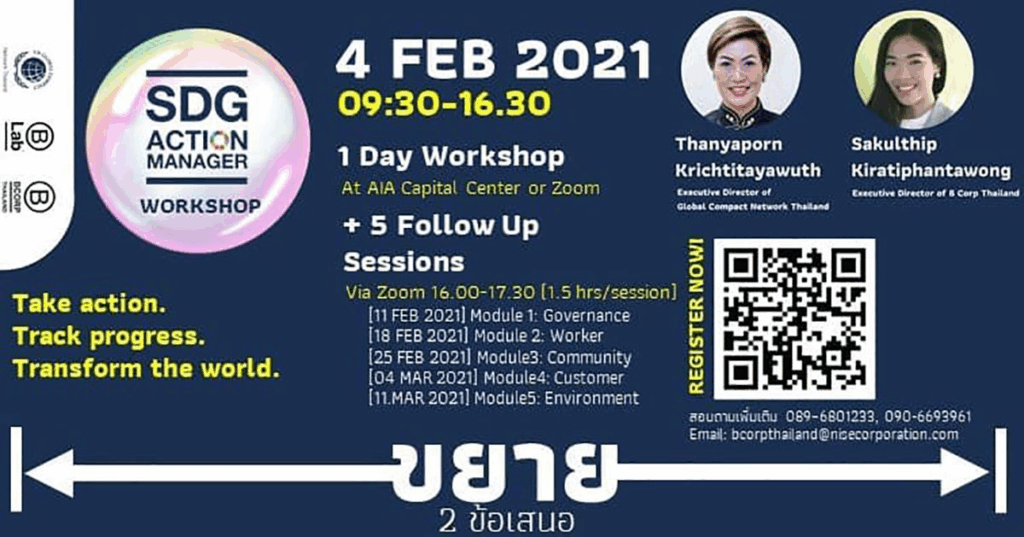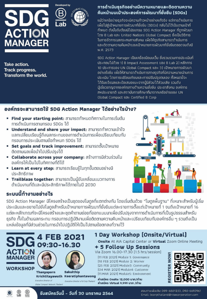 ในปีค.ศ. 2021 นี้ Global Compact Network Thailand และ B CORP Thailand มุ่งเป้าในการถ่ายทอดองค์ความรู้ SDG Action Manager ผ่านหลักสูตร “SDG Action Manager Workshop”