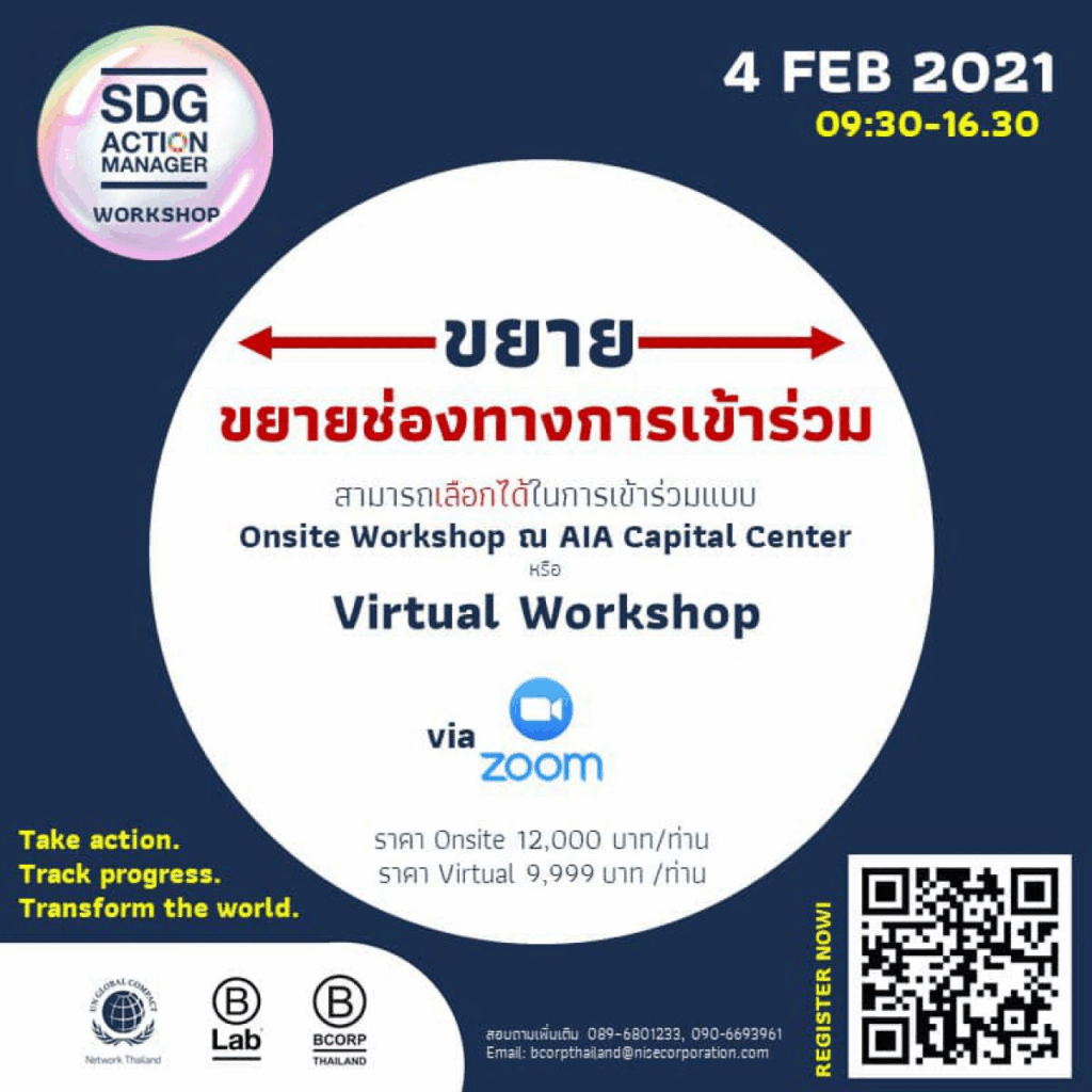 SDG Action Manager Workshop จัดในวันพฤหัสที่ 4 กุมภาพันธ์ พ.ศ. 2564 เวลา 09.30 – 16.30 น. ณ ห้องประชุม Global Compact Network Thailand ชั้น 31 อาคาร AIA Capital Center (https://goo.gl/maps/X4cQdUUfQEzX5vKU9) และ
