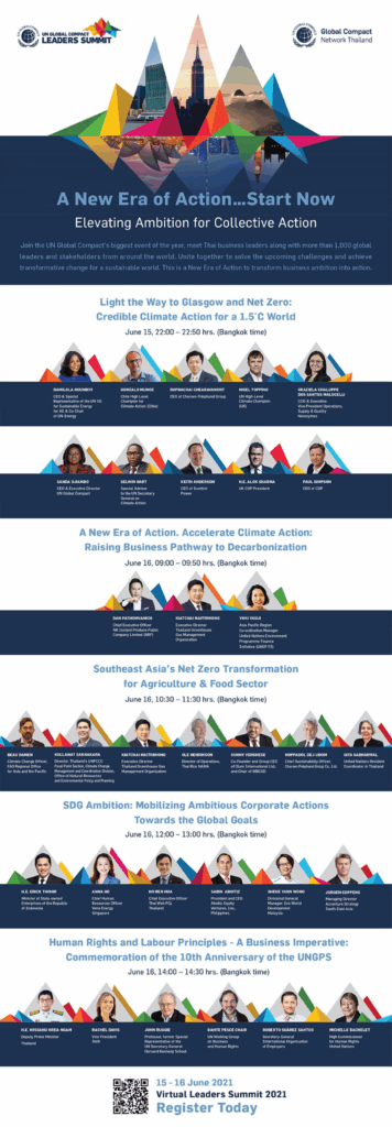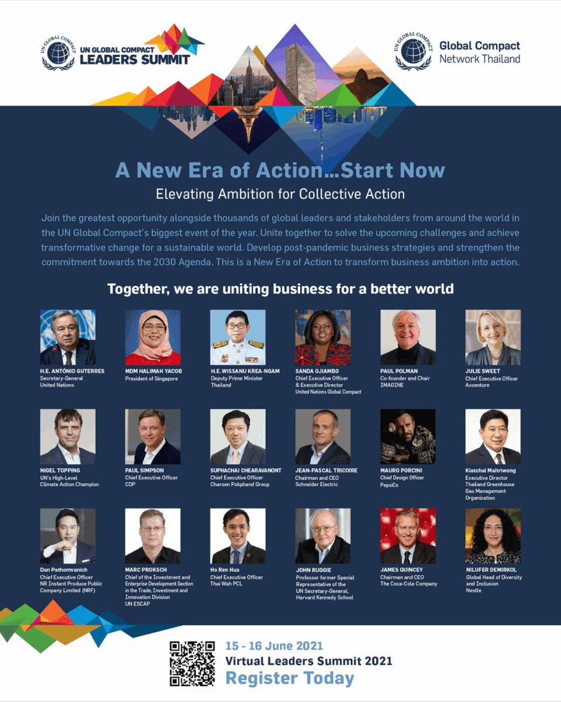 สมาคมเครือข่ายโกลบอลคอมแพ็กแห่งประเทศไทย (Global Compact Network Thailand: GCNT) เครือข่ายท้องถิ่น (Local Network) ของโครงการสำคัญระดับโลกขององค์การสหประชาชาติ เตรียมจัดฟอรั่มใหญ่ระดับโลก “Virtual Leaders Summit 2021”  ระดมทัพสุดยอดผู้นำจากทั่วโลก รับมือกับความท้าทายของวิกฤตโควิด-19 และความเปลี่ยนแปลงสภาพภูมิอากาศที่รวดเร็ว ทั้งผู้กำหนดนโยบาย ภาครัฐ ภาคธุรกิจ ภาควิชาการและภาคประชาสังคม กว่า 1,000 คน อาทิ  อันโตนิโอ กูเตร์เรส เลขาธิการสหประชาชาติ ฮาลีมะฮ์ ยากอบ ประธานาธิบดีสิงคโปร์ วิษณุ เครืองาม รองนายกรัฐมนตรีไทย ไนเจล ท้อปปิ้ง High-Level Climate Champions for Climate Action COP26 เจมส์ ควินซีย์  ซีอีโอ โคคา-โคลา จูลี่ สวีท ซีอีโอ เอคเซนเซอร์   พร้อมด้วยนักธุรกิจจากประเทศไทย นายกสมาคมเครือข่ายโกลบอลคอมแพ็กแห่งประเทศไทย ศุภชัย เจียรวนนท์ ได้รับเกียรติในการร่วมเสวนาบนเวทีระดับโลก และซีอีโอองค์กรชั้นนำ ซึ่งเป็นสมาชิกของสมาคมเครือข่ายโกลบอลคอมแพ็กฯ  บมจ. เอ็นอาร์ อินสแตนท์ โปรดิวซ์  บมจ. ไทยวาองค์การบริหารก๊าซเรือนกระจก (อบก.) ร่วมระดมความคิด ผนึกกำลังปรับเป้าหมายทางธุรกิจ  เพื่อจัดการกับวิกฤตการเปลี่ยนแปลงสภาพภูมิอากาศที่มาบรรจบการระบาดของโควิด-19  ความไม่เท่าเทียมกันทางสังคม  เศรษฐกิจที่เลวร้ายลง  และการคอร์รัปชั่นที่ไม่ถูกตรวจสอบ  รวมทั้งเสนอแผนงานเพื่อการฟื้นตัวอย่างยั่งยืน  พร้อมเปิดประชุมทางไกลสร้างเครือข่าย Online Networking ตลอด 26 ชั่วโมง ในวันที่ 15-16 มิถุนายนนี้