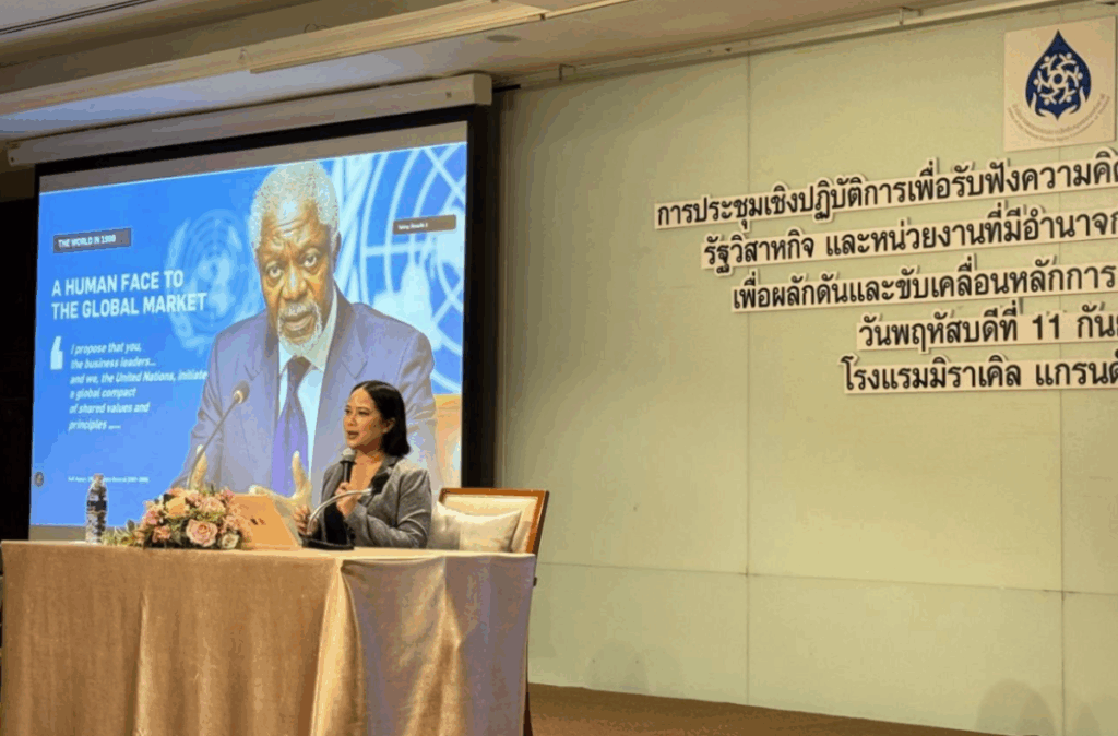 ภายในงาน คุณเพ็ญพิชชา จรรย์โกมล ผู้แทน UN Global Compact Network Thailand ได้นำเสนอหลักการสากล 10 ประการที่ภาคธุรกิจควรยึดถือ ครอบคลุมประเด็นสิทธิมนุษยชน แรงงาน สิ่งแวดล้อม และการต่อต้านการทุจริต โดยเครือข่ายได้มีการตั้งสถาบันธุรกิจกับสิทธิมนุษยชน (BHR Academy) ขึ้น เพื่อเสริมสร้างความรู้ความเข้าใจในประเด็นสิทธิมนุษยชนสำหรับองค์กรภาคธุรกิจ และเพื่อพัฒนาศักยภาพในการนำหลักการและแนวปฏิบัติด้านสิทธิมนุษยชนที่ดีไปใช้ให้เกิดผลได้จริง รวมถึงสะท้อนความท้าทายของภาคธุรกิจต่อการปรับใช้หลักการการตรวจสอบสิทธิมนุษยชนอย่างรอบด้าน