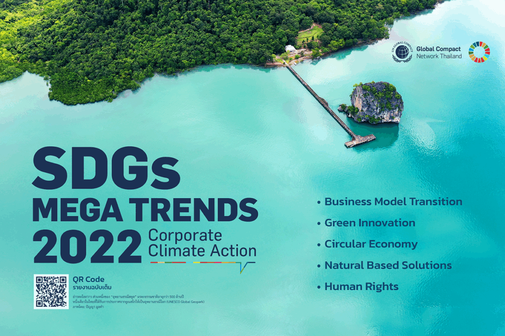 มีนาคม 2565: สมาคมเครือข่ายโกลบอลคอมแพ็กแห่งประเทศไทย เครือข่ายความยั่งยืนที่ใหญ่ที่สุดในประเทศไทย เผยแพร่รายงาน “SDGs Mega Trends 2022” แนวโน้มสำคัญเพื่อบรรลุเป้าหมายการพัฒนาที่ยั่งยืน ในปีนี้ชูเรื่องการปรับเปลี่ยนเพื่อป้องกันและแก้ปัญหาจากการเปลี่ยนแปลงสภาพภูมิอากาศ คือเทรนด์สำคัญที่ทุกธุรกิจต้องใส่ใจและเริ่มปรับตัวตั้งแต่วันนี้