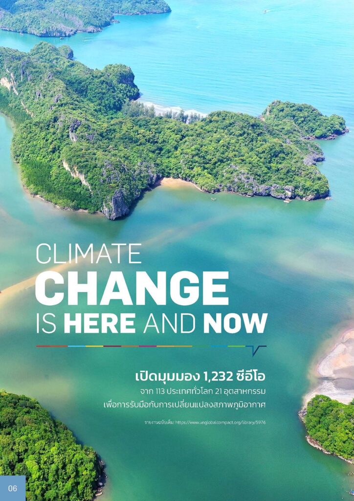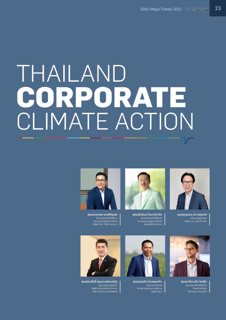 SDGs Mega Trends ปีนี้ ยังเปิดเผยข้อมูลของ UN Global Compact ที่ได้สำรวจมุมมองของซีอีโอทั่วโลกจำนวน 1,232 ท่าน จาก 113 ประเทศ จาก 21 ภาคอุตสาหกรรมเกี่ยวกับการเตรียมการขององค์กรธุรกิจเหล่านั้น เพื่อรับมือกับการเปลี่ยนแปลงสภาพภูมิอากาศ พร้อมบทสัมภาษณ์พิเศษของ 6 ซีอีโอจาก 6 องค์กรธุรกิจชั้นนำของประเทศไทย ที่ประกาศความมุ่งมั่นในการลดการปล่อยก๊าซเรือนกระจก รวมถึงเร่งลงมือสร้างความเปลี่ยนแปลงอย่างจริงจัง พร้อมทั้งตั้งเป้าหมายและการวัดผลการปล่อยก๊าซเรือนกระจกสุทธิเป็นศูนย์ บนพื้นฐานทางวิทยาศาสตร์ เพื่อนำเสนอวิธีการแก้ปัญหาใหม่ ๆ สู่ความยั่งยืน ที่สามารถนำมาปรับใช้ในห่วงโซ่คุณค่า รวมถึงการวางนโยบาย กลยุทธ์และแผนปฏิบัติงานที่เป็นรูปธรรม ซึ่งทุกองค์กรสามารถนำไปประยุกต์ใช้ได้