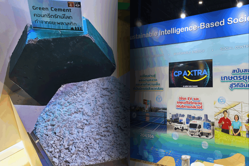 CP ALL ที่ได้มีการนำเสนอ Green Cement คอนกรีตรักษ์โลกทำจากขยะพลาสติก เพื่อสร้างลานอเนกประสงค์รักษ์โลก ส่งเสริมนโยบาย 7 Go Green อย่างยั่งยืน โดยเป็นโครงการลดขยะ จากการนำขยะพลาสติกของลูกค้า 7-ELEVEN, สำนักงาน และคลังสินค้าของ CP ALL ที่สามารถลดการใช้ปูนและทราย รวมถึงยังสามารถลดปริมาณขยะพลาสติกที่ทิ้งลงหลุมฝังกลบได้
