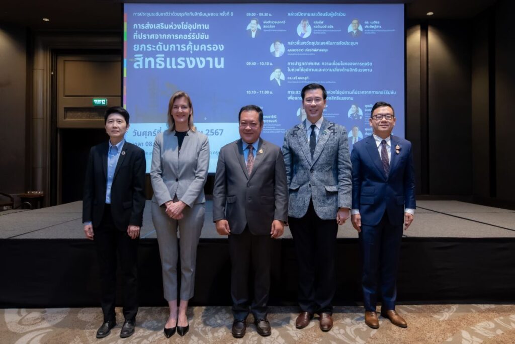 ต่อด้วย การเสวนา ในหัวข้อ “การส่งเสริมห่วงโซ่อุปทานที่ปราศจากการคอร์รัปชัน เพื่อยกระดับการคุ้มครองสิทธิแรงงาน” โดยมีผู้ร่วมเสวนา ได้แก่