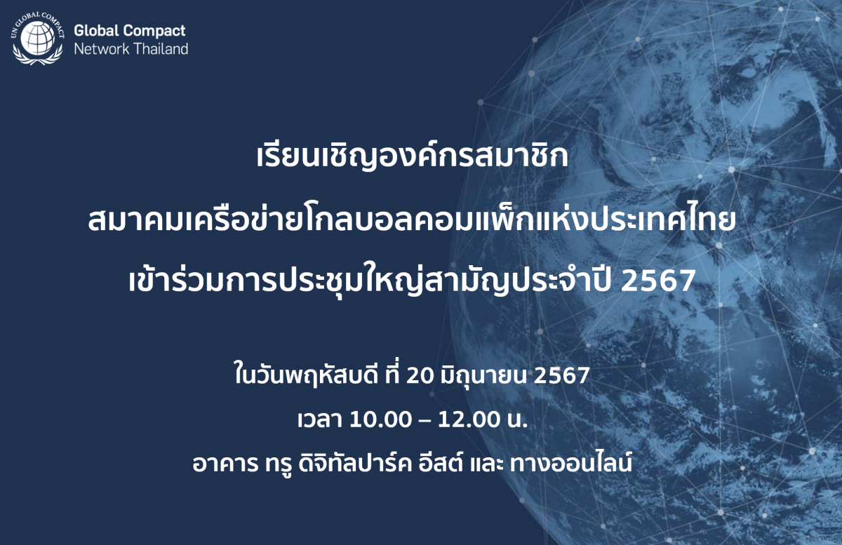 ขอเรียนเชิญ สมาชิกสมาคมเครือข่ายโกลบอลคอมแพ็กแห่งประเทศไทย (UN Global Compact Network Thailand) เข้าร่วมการประชุมสามัญประจำปี 2567 ที่จะจัดขึ้นในวันพฤหัสบดีที่ 20 มิถุนายน 2567 เวลา 10:00 -12:00 น. ณ อาคาร ทรู ดิจัลปาร์ค อีสต์ และทางออนไลน์
