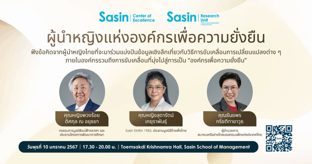 Sasin School of Management (สถาบันบัณฑิตบริหารธุรกิจศศินทร์ แห่งจุฬาลงกรณ์มหาวิทยาลัย) ขอเชิญร่วมฟังเสวนา “ผู้นำหญิงแห่งองค์กรเพื่อความยั่งยืน”
