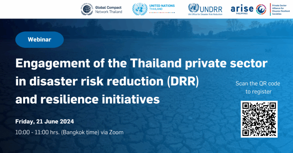 The webinar is organized by the UN Global Compact Network Thailand, the United Nations in Thailand, and the United Nations Disaster Risk Reduction Asia Pacific Office, in collaboration with ARISE Philippines, specially invited to present its programs, initiatives, and best practices in disaster risk reduction and resilience among the private sectors in the Philippines.