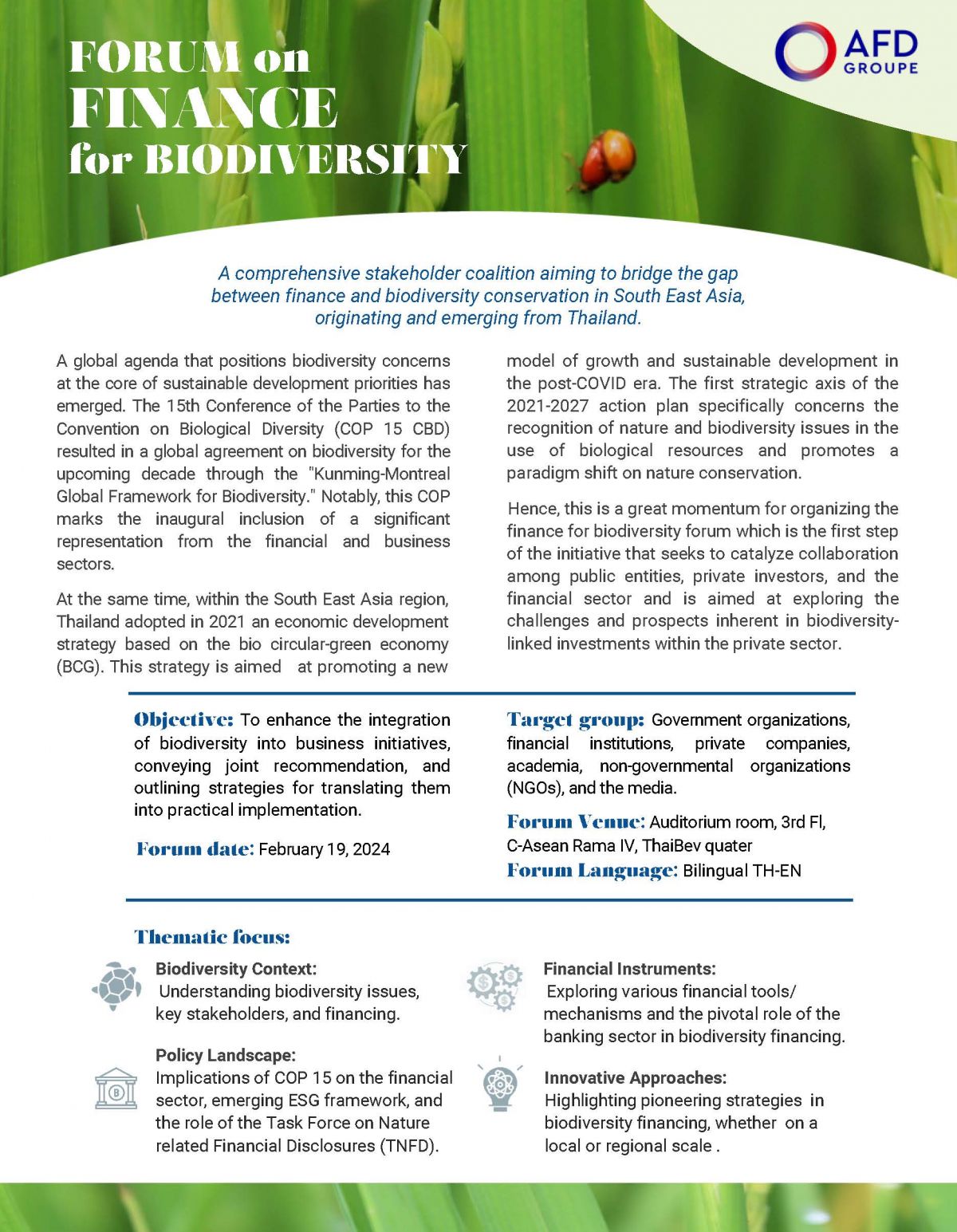 สำนักงานเพื่อการพัฒนาแห่งสาธารณรัฐฝรั่งเศส (AFD-Agence Françoise de Développement) ร่วมกับสำนักงานนโยบายและแผนทรัพยากรธรรมชาติและสิ่งแวดล้อม กำหนดจัดการสัมมนาเวทีการเงินเพื่อความหลากหลายทางชีวภาพ (Finance for Biodiversity) ในประเทศไทย ในวันจันทร์ที่ 19 กุมภาพันธ์ 2567 เวลา 09:00-17:00 น. ณ ห้องประชุม AUDITORIUM ชั้น 3 ซี อาเซียน พระราม 4 (C ASEAN RAMA IV) อาคารไทยเบฟควอเตอร์ ถนนรัชดาภิเษก คลองเตย กรุงเทพฯ เพื่อประกาศเจตนารมณ์ Fin4Bio ในการขับเคลื่อนการดำเนินงานการเงินเพื่อความหลากหลายทางชีวภาพ ตลอดจนให้ภาคส่วนที่เกี่ยวข้องได้มีแนวทางการดำเนินงานที่เหมาะสมกับบริบทของประเทศต่อไป