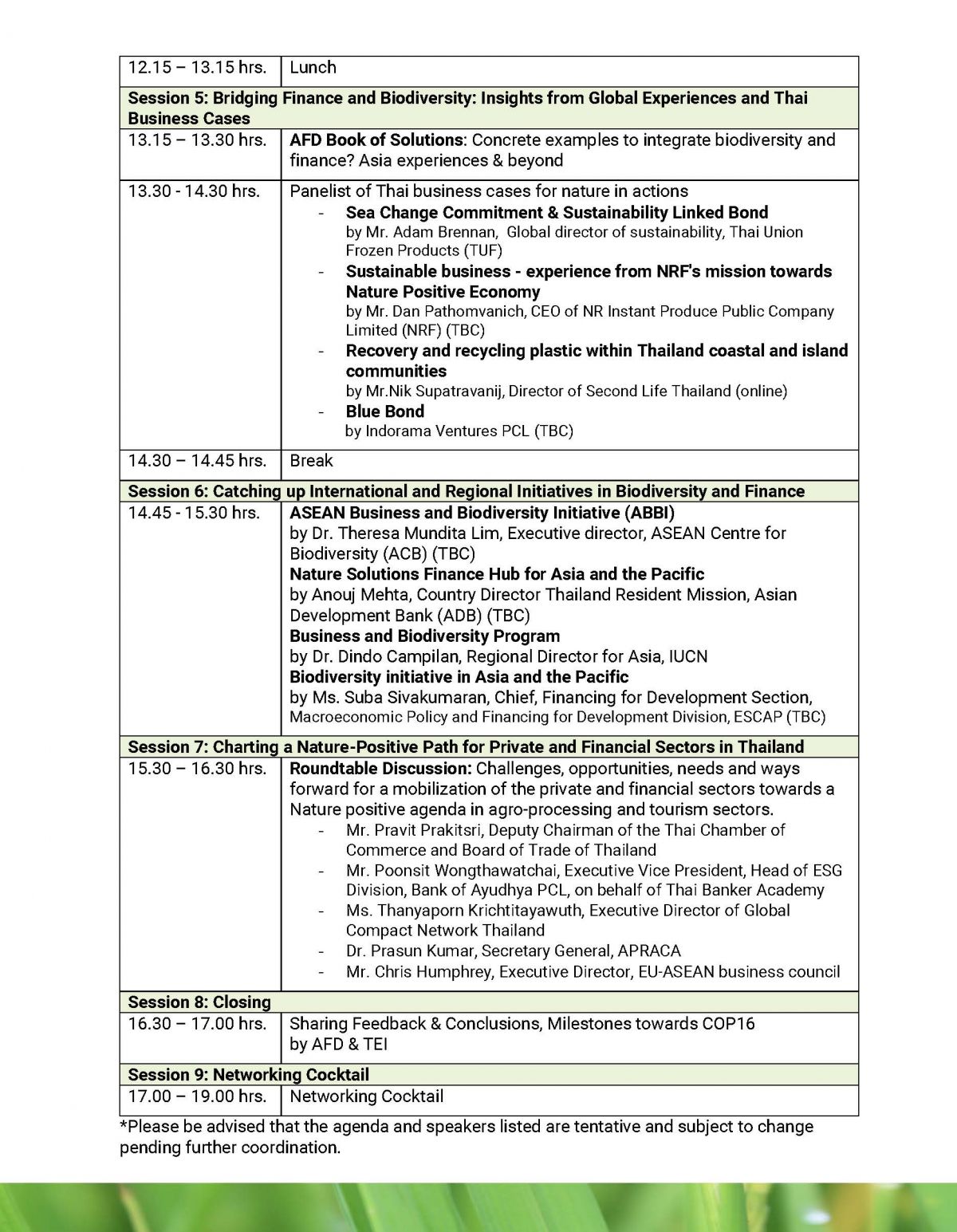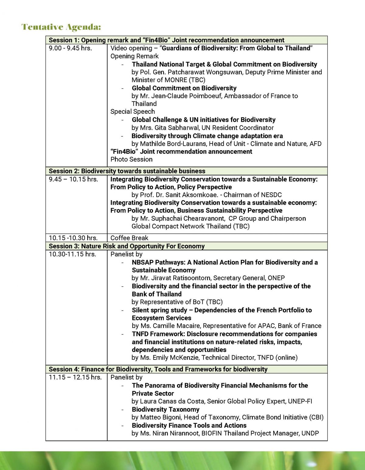ขอเชิญสมาชิก UNGCNT ร่วมสนับสนุนข้อเสนอแนะร่วมจากเวทีสัมมนา (Fin4Bio Joint recommendations) เพื่อแสดงเจตนารมณ์ที่นำไปสู่การพัฒนาการเงินเพื่อความหลากหลายทางชีวภาพของกลุ่มพันธมิตรผู้มีส่วนได้ส่วนเสีย โดยข้อเสนอแนะมีเนื้อหาเกี่ยวกับการสนับสนุนการพัฒนา Taxonomy ด้านความหลากหลายทางชีวภาพของไทย การส่งเสริมให้มีการประเมินและเปิดเผยความเสี่ยงของภาคธุรกิจที่เกี่ยวข้องกับธรรมชาติ มาตรการสิ่งจูงใจสำหรับการพัฒนาเศรษฐกิจที่เป็นมิตรแก่ธรรมชาติ (Nature Positive Economy) รวมถึงการเสริมสร้างขีดความสามารถ การแบ่งปันความรู้และสิ่งจูงใจในการบูรณาการความหลากหลายทางชีวภาพเข้าสู่โมเดลธุรกิจ