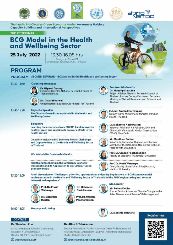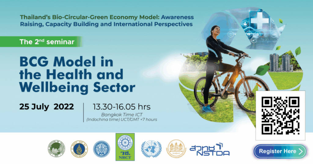 We are pleased to invite you to the second seminar on Thailand’s Bio-Circular-Green Economy Model: Awareness Raising, Capacity Building and International Perspective. This seminar will focus on the ‘Health and Wellbeing Sector’ and will be held on Monday, 25 July 2022, 13:30 to 16:05 hrs Bangkok Time GMT+7 (Virtual). The speakers will introduce the BCG model and broadly describe how it is being applied.