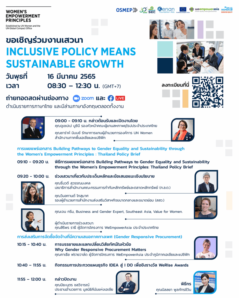 WeEmpowerAsia Thailand (UN Women) is pleased to invite you to the “Inclusive Policy means Sustainable Growth” seminar to be held on 16th March 2022 at 08:30AM – 12:30PM (GMT) online through Zoom and Facebook Live on the Securities and Exchange Commission@sec.or.th, OSMEP @officeofsmes and Kenan Facebook @KenanThailand pages.
