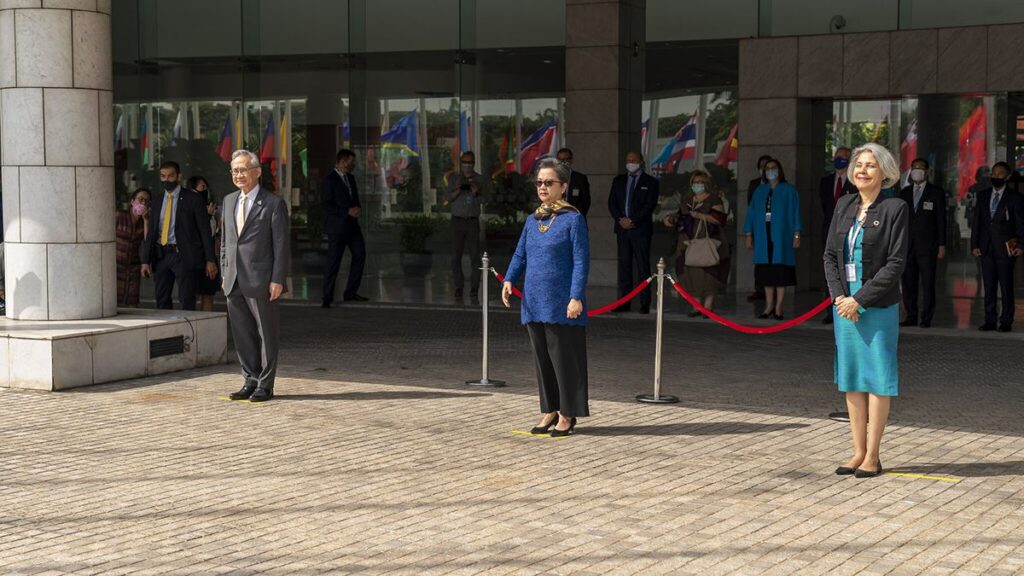 (ขวาไปซ้าย) กีต้า ซับบระวาล ผู้ประสานงานสหประชาติ ประจำประเทศไทย, อารมิดา ซาลสิอาห์ อลิสจาห์บานา เลขาธิการบริหารคณะกรรมการเศรษฐกิจและสังคมของเอเชียและแปซิฟิกแห่งสหประชาชาติ (ESCAP) และ ดอน ปรมัตถ์วินัย รองนายกรัฐมนตรีและรัฐมนตรีว่าการกระทรวงการต่างประเทศ ในงานครบรอบ 75 ปี สหประชาชาติ (UN Day) ที่อาคารสหประชาชาติ กรุงเทพ 26 ตุลาคม 2020