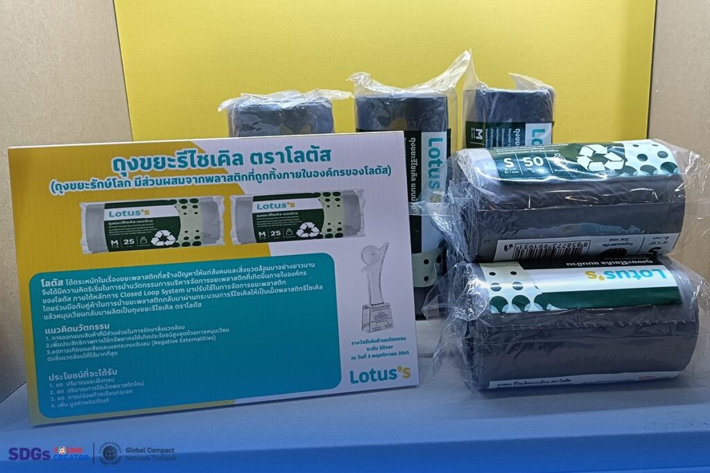 โลตัสได้พัฒนาถุงขยะรีไซเคิลที่ทำจากพลาสติกที่ได้จากกระบวนการรีไซเคิลภายในองค์กร โดยการนำพลาสติกที่ถูกทิ้งกลับมาใช้ใหม่ในกระบวนการผลิตถุงขยะรูปแบบใหม่ ซึ่งนอกจากจะช่วยลดปริมาณพลาสติกใหม่ที่ต้องผลิตแล้ว ยังเป็นการลดผลกระทบเชิงลบต่อสิ่งแวดล้อม (Negative Externalities) และสนับสนุนการจัดการทรัพยากรให้มีประสิทธิภาพมากยิ่งขึ้น