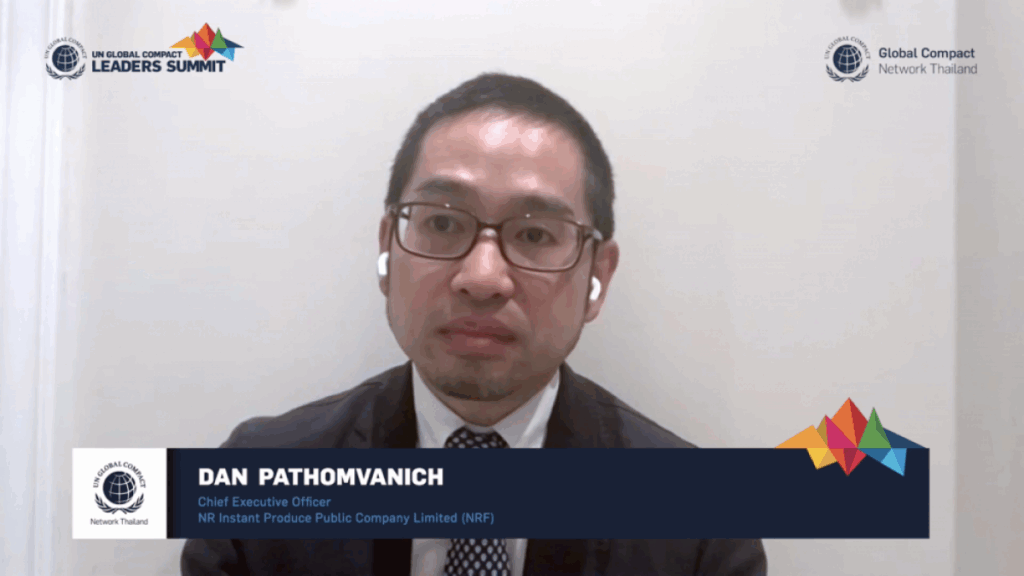 ด้านคุณแดน ปฐมวาณิชย์ ประธานเจ้าหน้าที่บริหาร บริษัท เอ็น อาร์ อินสแตนท์ โปรดิวซ์ จำกัด (มหาชน) เปิดวิสัยทัศน์และเป้าหมายขององค์กร หัวข้อ “A New Era of Action. Accelerate Climate Action: Raising Business Pathway to Decarbonization” หรือ “การต่อสู้กับการเปลี่ยนแปลงของสภาพภูมิอากาศ: ยกระดับแนวทางธุรกิจเพื่อลดการปล่อยก๊าซเรือนกระจก” โดยกล่าวว่า เอ็นอาร์เอฟ จะทำให้โลกปลอดคาร์บอนผ่านการเปลี่ยนแปลงระบบอาหาร โดยระบุอยู่ในทุกสิ่งขององค์กร ตั้งแต่วิสัยทัศน์ นโยบาย และเป้าหมายที่จะเป็นผู้ผลิตโปรตีนทางเลือกและอาหารจากพืชที่ใหญ่ที่สุดในโลก โดยสร้างเครือข่ายกำลังการผลิตที่ครอบคลุมมากที่สุดในโลก ตั้งแต่แบรนด์ระดับสากล ไปจนถึงสตาร์ทอัพ สู่ซุปเปอร์มาร์เก็ต เพื่อเปลี่ยนไปสู่การผลิตอาหารคาร์บอนต่ำอย่างยั่งยืน สิ่งที่เอ็นอาร์เอฟให้ความสำคัญก็คือ การบริหารจัดการห่วงโซ่อุปทาน ให้เข้าใจถึงวิสัยทัศน์และเป้าหมายขององค์กร ด้วยการมีนโยบายที่ชัดเจนที่ถ่ายทอดจากระดับผู้บริหารสูงสุด ไปถึงผู้บริหารระดับกลาง และผู้ปฏิบัติงานในระดับจัดซื้อ เพื่อให้มั่นใจว่าได้ผลิตภัณฑ์ที่มีคุณภาพตรงตามมาตรฐานขององค์กร