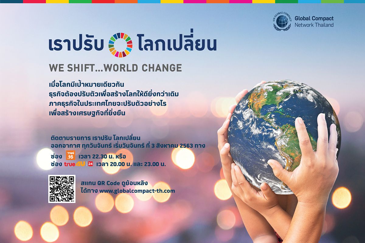 สมาคมเครือข่ายโกลบอลคอมแพ็กแห่งประเทศไทย ร่วมกับองค์กรสมาชิก ปั้นคอนเทนต์รายการ “เราปรับ … โลกเปลี่ยน” เพื่อสร้างสังคมแห่งการเรียนรู้แนวคิดด้านการพัฒนาเพื่อความยั่งยืนจากเหล่าองค์กรชั้นนำที่จะมาร่วมแบ่งปันวิสัยทัศน์ ถ่ายทอดประสบการณ์ และมุมมองธุรกิจบนรากฐานของความยั่งยืน ภาคธุรกิจจะต้องปรับตัวอย่างไร เพื่อสร้างเศรษฐกิจที่ยั่งยืนให้ดียิ่งขึ้นกว่าเดิม ผ่านรายการ “เราปรับ โลกเปลี่ยน” ออกอากาศทุกวันจันทร์ ทางช่อง TNN16 เวลา 22.30 น. หรือ ช่อง TRUE4U เวลา 20.00 น. และ 23.00 น. แฟนพันธุ์แท้ด้านความยั่งยืน ห้ามพลาด!