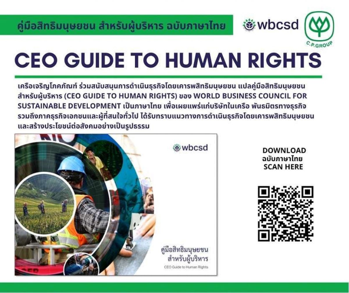 เครือเจริญโภคภัณฑ์ ร่วมสนับสนุนการดำเนินธุรกิจโดยเคารพสิทธิมนุษยชน แปลคู่มือสิทธิมนุษยชนสำหรับผู้บริหาร (CEO Guide to Human Rights) ของ World Business Council for Sustainable Development เป็นภาษาไทยเพื่อเผยแพร่แก่บริษัทในเครือ พันธมิตรทางธุรกิจ ร่วมถึงภาคธุรกิจเอกชนและผู้ที่สนใจทั่วไป ได้รับทราบแนวทางการดำเนินธุรกิจโดยเคารพสิทธิมนุษยชนและสร้างประโยชน์ต่อสังคมอย่างเป็นรูปธรรม